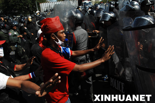 3月26日,一名泰國反獨裁民主聯盟(反獨聯)的支持者在曼谷總理府外與警察對峙。當日,反獨聯的支持者在曼谷舉行大規(guī)模反政府集會并包圍了總理府。新華社發(fā)(塔納攝)
