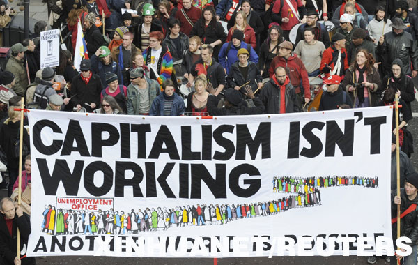 3月28日,在英國倫敦市中心,抗議者走上街頭示威。當(dāng)日,倫敦爆發(fā)大規(guī)模游行,示威者舉著橫幅標(biāo)語,表達(dá)對貧困、就業(yè)和氣候現(xiàn)狀的不滿。新華社/路透