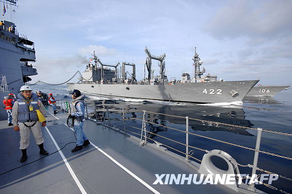 這張3月28日在亞丁灣拍攝的照片顯示,日本海上自衛(wèi)隊的“十和田”補給艦(右,422號)在為“漣”號驅(qū)逐艦(左)加油。