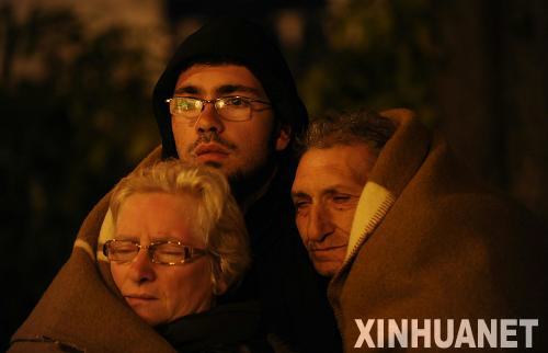 4月7日凌晨,在意大利中部地震災(zāi)區(qū)拉奎拉市,三名災(zāi)民裹著毯子依偎在一起。新華社記者武巍攝