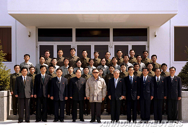 朝鮮中央通訊社4月6日提供的照片顯示,朝鮮最高領(lǐng)導(dǎo)人金正日(前左五)5日在衛(wèi)星控制綜合指揮所與工作人員合影。據(jù)朝鮮中央通訊社6日報道,朝鮮最高領(lǐng)導(dǎo)人金正日5日觀看了朝鮮發(fā)射“光明星2號”試驗(yàn)通信衛(wèi)星的全過程,高度贊揚(yáng)科技人員取得的成果。新華社/路透
