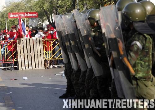 4月12日,在泰國首都曼谷,士兵在反政府示威者聚集處附近警戒。據(jù)泰國媒體報道,泰軍方12日下午開始在位于首都曼谷的集拉達王宮、國會、外交部等地部署士兵,以確保這些場所安全。當(dāng)天下午,泰國總理阿披實宣布在首都曼谷和中部5個府部分地區(qū)實施緊急狀態(tài)法。新華社/路透