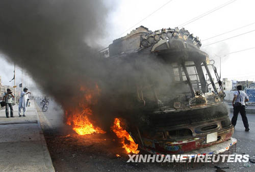 4月29日,巴基斯坦南部城市卡拉奇街頭的一輛汽車起火。據(jù)巴基斯坦當(dāng)?shù)仉娨暸_報道,卡拉奇多個地區(qū)29日發(fā)生暴力事件,造成至少23人死亡,20多人受傷。 新華社/路透