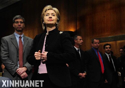 4月30日,美國國務(wù)卿希拉里·克林頓在華盛頓國會(huì)山出席國會(huì)參議院預(yù)算委員會(huì)舉行的聽證會(huì),就奧巴馬政府2009財(cái)政年度預(yù)算案回答參議員的提問。新華社記者張巖攝