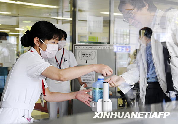 5月1日,在日本橫濱市立市民醫(yī)院,一名護(hù)士幫助訪客消毒。新華社/法新