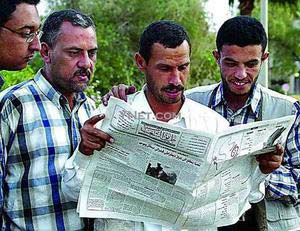 資料圖片:伊拉克男子在首都巴格達(dá)閱讀《人民之路》報(bào)。在伊拉克薩達(dá)姆政權(quán)倒臺(tái)以后,伊拉克第一份阿拉伯文報(bào)紙《人民之路》20日在巴格達(dá)面世。這份報(bào)紙由伊拉克共產(chǎn)黨創(chuàng)辦,創(chuàng)刊號(hào)共8版,免費(fèi)分發(fā)給讀者,深受巴格達(dá)民眾的歡迎。這期《人民之路》創(chuàng)刊號(hào)的頭版頭條刊登了一篇題為“專制的崩潰”的長(zhǎng)篇文章,而刊登在最后一版的文章題目是“伊拉克人民需要一個(gè)民主、獨(dú)立、統(tǒng)一的聯(lián)邦制伊拉克”。在薩達(dá)姆時(shí)代,除了由伊拉克阿拉伯復(fù)興社會(huì)黨發(fā)行的報(bào)紙外,其他任何黨派都不能創(chuàng)辦、發(fā)行報(bào)紙。新華/法新