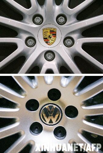 這是帶有保時(shí)捷標(biāo)志(上)和大眾標(biāo)志(下)的汽車輪轂的拼版照片。 新華社/法新