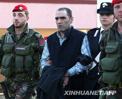 5月10日,在意大利卡拉布里亞地區(qū),當(dāng)?shù)匾粋(gè)黑手黨頭目薩爾瓦托雷·科盧喬(中)被警方逮捕?票R喬是卡拉布里亞地區(qū)臭名昭著的一個(gè)黑手黨家族頭目,4年前開始逃亡,被列為意大利最危險(xiǎn)的30名潛逃者之一。新華社/法新