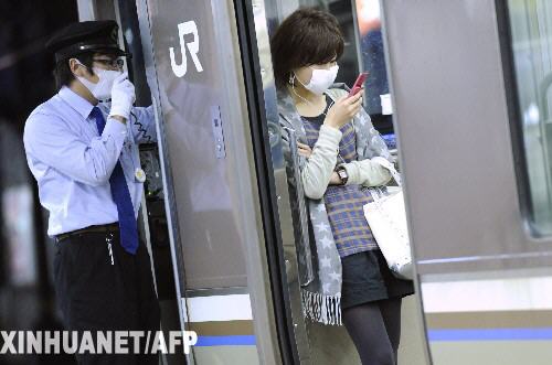 5月17日,在日本兵庫縣神戶的新干線車站內(nèi),工作人員和乘客都戴上了口罩。新華社/法新