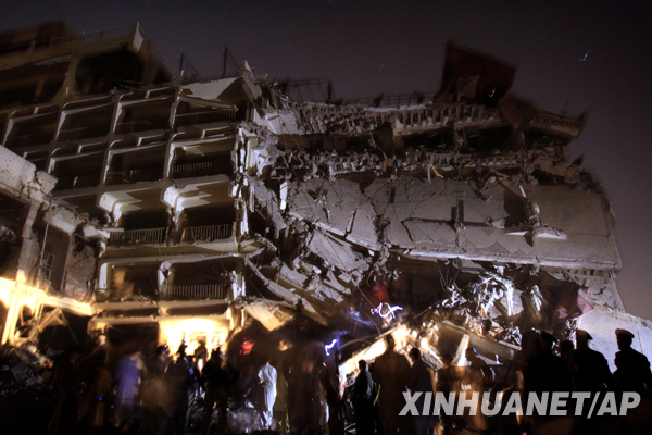 6月9日,在巴基斯坦西北邊境省首府白沙瓦,人們站在被炸毀的五星級(jí)酒店大樓前。據(jù)巴基斯坦當(dāng)?shù)仉娨暸_(tái)報(bào)道,白沙瓦市的一個(gè)五星級(jí)酒店9日晚發(fā)生炸彈爆炸,目前死亡人數(shù)已升至11人,另有約50人受傷。 新華社/美聯(lián)