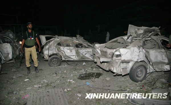 6月9日,在巴基斯坦西北邊境省首府白沙瓦,一名警察站在發(fā)生爆炸的五星級(jí)酒店門(mén)口。據(jù)巴基斯坦當(dāng)?shù)仉娨暸_(tái)報(bào)道,白沙瓦市的一個(gè)五星級(jí)酒店9日晚發(fā)生炸彈爆炸,目前死亡人數(shù)已升至11人,另有約50人受傷。 新華社/路透