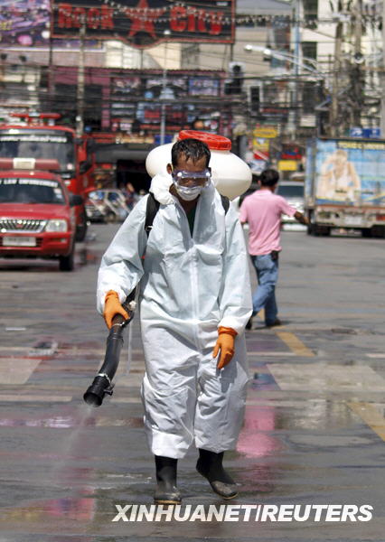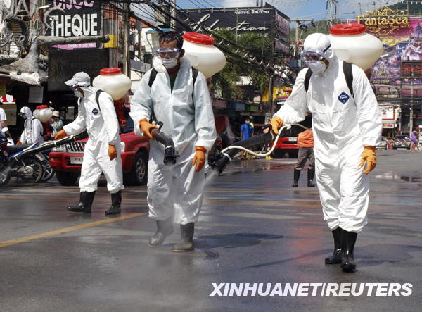 6月14日,泰國(guó)衛(wèi)生工作人員在普吉島一處海灘附近噴灑消毒藥水。泰國(guó)衛(wèi)生部當(dāng)日宣布,泰國(guó)新確診甲型H1N1流感病例44例,這使得泰國(guó)甲型H1N1流感確診病例增至150例。新華社/路透