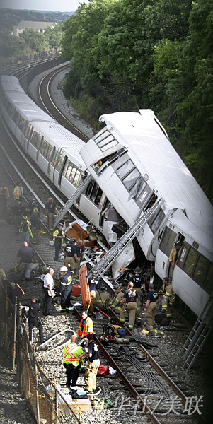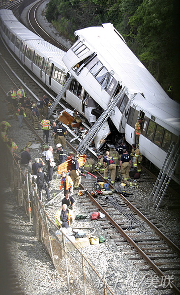 6月22日,在美國首都華盛頓哥倫比亞特區(qū)和馬里蘭州交界處附近,救援人員在地鐵火車相撞事故現(xiàn)場忙碌。新華社/美聯(lián)