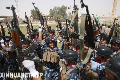 6月30日,在伊拉克首都巴格達(dá)以南110公里的卡爾巴拉,一些伊拉克士兵參加閱兵式后歡呼慶祝駐伊美軍戰(zhàn)斗部隊(duì)撤出伊城鎮(zhèn)。根據(jù)美伊雙方的協(xié)議,美軍戰(zhàn)斗部隊(duì)在6月30日前全部撤出伊拉克城鎮(zhèn),伊拉克安全部隊(duì)將接管安全防務(wù)。 新華社/法新