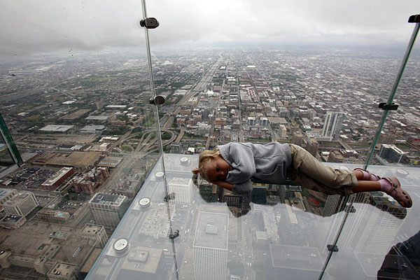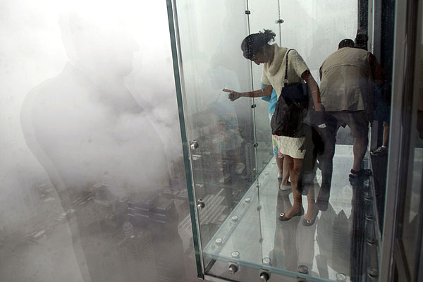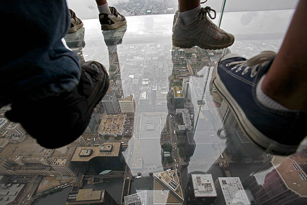 7月1日,美國(guó)芝加哥,西爾斯大廈在第103層瞭望臺(tái)增設(shè)的玻璃陽(yáng)臺(tái)對(duì)媒體開放。這些玻璃陽(yáng)臺(tái)建在大廈西側(cè),從瞭望臺(tái)向外延伸約1.2米。陽(yáng)臺(tái)的玻璃地板厚達(dá)12.7厘米,可承重約5噸。