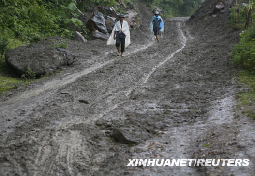 7月6日,在越南北部北件省,人們行走在被洪水沖毀的道路上。越南防洪指導(dǎo)委員會(huì)當(dāng)日說,肆虐3天的山洪已造成至少20人死亡,18人失蹤,越南北部多處道路和房屋損毀。新華社/路透