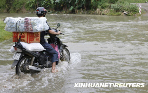 7月6日,在越南北部北件省,一名男子騎摩托車行進(jìn)在被洪水淹沒的道路上。越南防洪指導(dǎo)委員會(huì)當(dāng)日說,肆虐3天的山洪已造成至少20人死亡,18人失蹤,越南北部多處道路和房屋損毀。新華社/路透