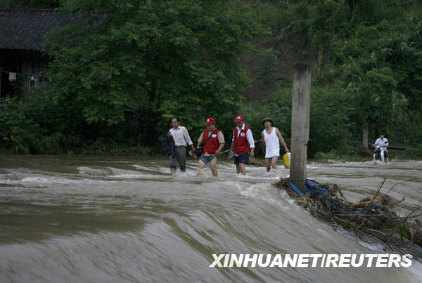 7月6日,在越南北部北件省,紅十字會(huì)志愿者在被洪水淹沒的道路上跋涉。越南防洪指導(dǎo)委員會(huì)當(dāng)日說,肆虐3天的山洪已造成至少20人死亡,18人失蹤,越南北部多處道路和房屋損毀。新華社/路透