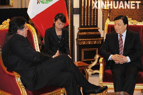 劉云山首先轉(zhuǎn)達(dá)了中共中央總書記、中國(guó)國(guó)家主席胡錦濤對(duì)加西亞總統(tǒng)的親切問候。劉云山說,中秘自1971年建交以來,兩國(guó)關(guān)系發(fā)展順利。2008年兩國(guó)元首成功實(shí)現(xiàn)互訪,中秘宣布建立戰(zhàn)略伙伴關(guān)系,使雙邊關(guān)系進(jìn)入了新的階段,中秘自由貿(mào)易協(xié)定的簽署對(duì)中秘經(jīng)貿(mào)關(guān)系發(fā)展具有重要意義。兩國(guó)人文領(lǐng)域的交流與合作勢(shì)頭良好。中方高度贊賞秘魯政府在臺(tái)灣、涉藏等問題上給予中國(guó)政府的堅(jiān)定支持。中方愿與秘方一道,不斷深化兩國(guó)戰(zhàn)略伙伴關(guān)系,努力拓展兩國(guó)合作的深度和廣度。