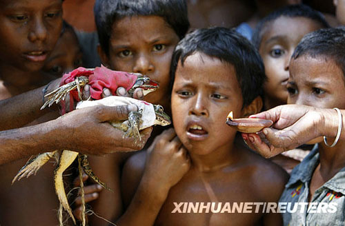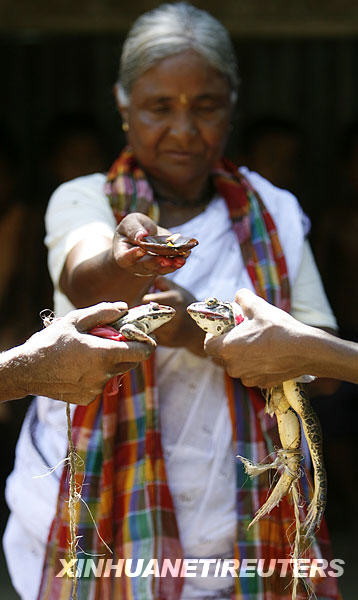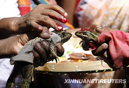 7月19日,在印度城市西里古里以東約85公里的一處村莊,村民舉行儀式為兩只青蛙“完婚”。為青蛙舉行婚禮是當(dāng)?shù)亓?xí)俗,以求風(fēng)調(diào)雨順、五谷豐登。新華社/路透
