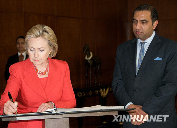7月18日,在印度孟買的泰姬瑪哈酒店,到訪的美國國務卿希拉里·克林頓(前左)在留言簿上簽名。希拉里于17日晚到達孟買,開始對印度的數(shù)天正式訪問。這是希拉里就任美國國務卿以來對印度的首次訪問。新華社發(fā)
