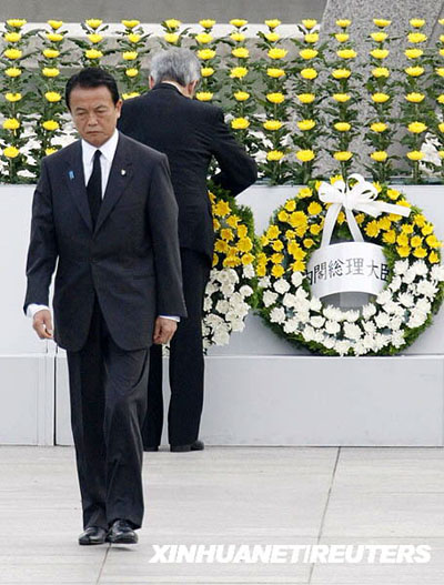 8月6日,在日本廣島,日本首相麻生太郎在向廣島原子彈轟炸的死難者獻(xiàn)花后離開。今年是日本廣島遭受原子彈轟炸64周年,日本各界人士在廣島舉行各種紀(jì)念活動(dòng),悼念原子彈爆炸死難者,祈禱世界和平。為敦促發(fā)動(dòng)侵略戰(zhàn)爭(zhēng)的日本盡快投降,美軍于1945年8月6日和9日分別向日本廣島市和長(zhǎng)崎市投下原子彈。日本是迄今世界上唯一一個(gè)遭受過原子彈轟炸的國(guó)家。新華社/路透