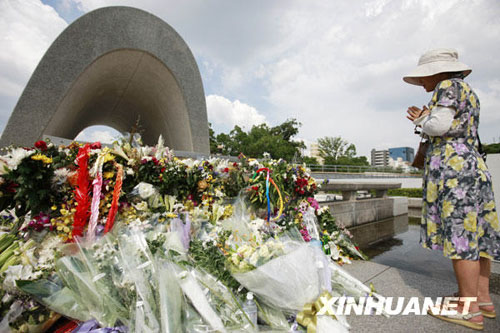 8月5日,在日本廣島和平紀(jì)念公園,一位女士站在原子彈爆炸死難者紀(jì)念碑前,悼念死去的親屬。新華社記者任正來攝