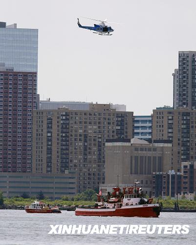8月8日,在美國(guó)紐約曼哈頓島西側(cè)的哈德孫河上,一架警用直升機(jī)和救援船只在飛機(jī)墜毀地點(diǎn)開展救援。新華社/路透