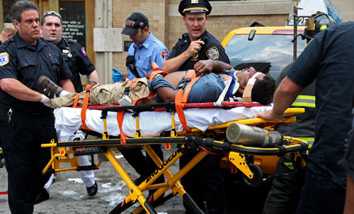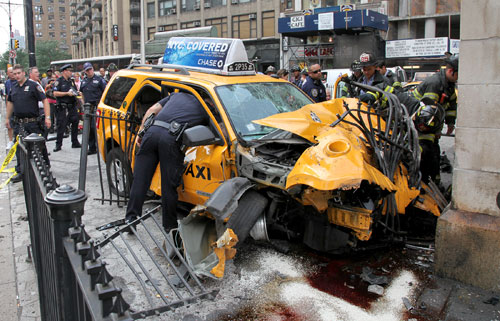 8月18日,美國紐約市內(nèi)一輛計程車撞上第72街與百老匯相鄰的地鐵站,3人受傷。圖為急救人員在現(xiàn)場進(jìn)行救援。