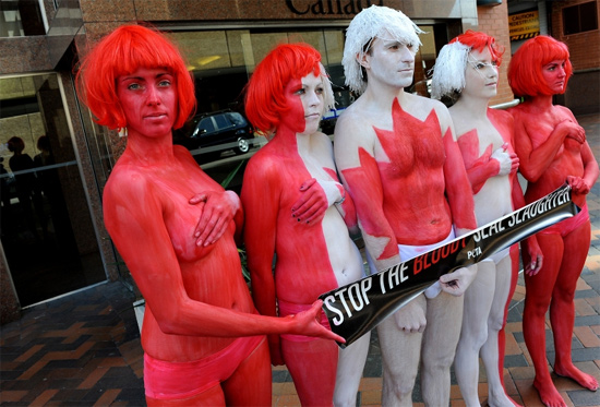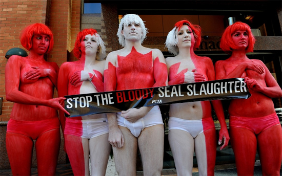 動(dòng)物保護(hù)組織PETA時(shí)刻準(zhǔn)備著吸引人們的眼球。據(jù)克羅地亞《晚報(bào)》報(bào)道,日前,該組織成員將身體繪制成加拿大國旗的顏色,抗議該國每年定期捕殺小海豹。