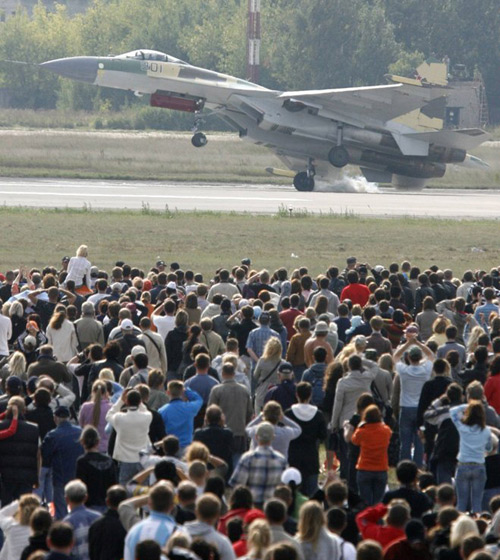 圖片是8月22日周六在航展上蘇-35飛行資料圖。有參觀者還誤以為是俄新式戰(zhàn)機(jī)在進(jìn)行特技表演。照片清楚顯示,飛機(jī)降落時(shí)發(fā)生傾斜,靠右側(cè)起落架落地。駕駛該飛機(jī)的是第一個(gè)(2008年2月)駕駛蘇-35的飛行員謝爾蓋·伯格達(dá)。(梁小逸)