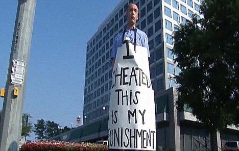 中新網(wǎng)8月28日電 據(jù)英國媒體27日報道,一名英國男子因和女人私通,東窗事發(fā)后被憤怒的妻子在頸上掛了一個寫著“我欺騙,這是我的懲罰”的告示牌,罰站街示眾。