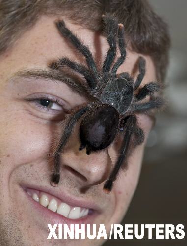 資料圖片:4月25日,在美國加利福尼亞州的康科德,一只狼蛛爬在它主人科迪·威爾的臉上。當(dāng)日,康科德舉辦蜘蛛集市,人們在這里展示并銷售各種蜘蛛。新華社/路透