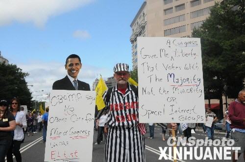 記者在現(xiàn)場看到,示威者舉著美國總統(tǒng)奧巴馬和美國眾議院議長佩洛西的肖像以及寫滿“不要更多的開支,不要更多的稅收,不要更多的謊言”、“我不是你的提款機(jī)”、“支持奧巴馬的醫(yī)療改革方案等于自殺”等各種各樣的標(biāo)語,還有人高喊“奧巴馬撒謊”、“我們受夠了”等口號。