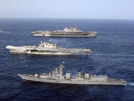 印度“維特拉”號航空母艦與“邁索爾”號驅(qū)逐艦同美海軍“尼米慈”號航空母艦在印度洋進行聯(lián)合演習。
