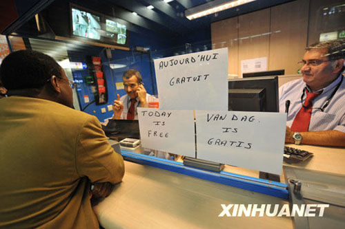 9月20日,在比利時首都布魯塞爾,地鐵售票窗口在“無車日”打出免費乘坐的標志。當天是布魯塞爾一年一度的“無車日”,政府鼓勵市民騎自行車或乘坐公共交通工具出行,樹立綠色城市交通的環(huán)保理念。新華社記者武巍攝