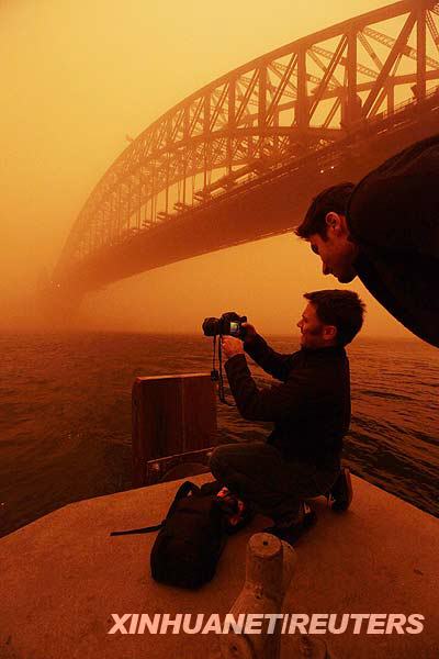 9月23日,一名攝影師在澳大利亞悉尼港大橋下拍照。當日,包括悉尼在內(nèi)的澳大利亞東部地區(qū)出現(xiàn)沙塵暴天氣,當?shù)亟煌ㄒ虼耸艿接绊,衛(wèi)生部門提高警惕應對呼吸道疾病患者激增。新華社/路透