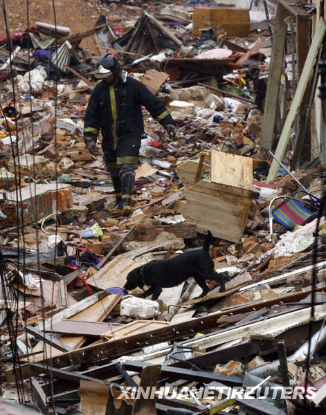 9月24日,在巴西圣保羅郊區(qū)的圣安德烈鎮(zhèn),一名警察帶著一條搜救犬在爆炸現(xiàn)場(chǎng)搜救。當(dāng)日,圣安德烈鎮(zhèn)發(fā)生一起煙花爆炸事故,造成幾座房屋被毀,至少3人死亡。新華社/路透