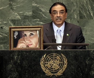 中新網(wǎng)9月27日電 巴基斯坦總統(tǒng)扎爾達里在聯(lián)合國大會上演講時,把他的已故夫人貝·布托和岳父布托的照片擺上演講臺,并吁請世界各國為巴國打擊恐怖主義和宗教極端主義提供更多協(xié)助。