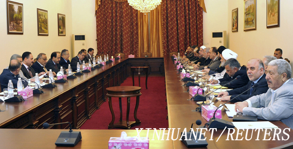 10月25日,伊拉克總統(tǒng)塔拉巴尼(左六)在首都巴格達(dá)主持召開(kāi)安全會(huì)議。巴格達(dá)市中心25日遭到連環(huán)自殺式汽車炸彈襲擊,已造成大量人員死傷。新華社/路透