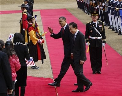 中新網(wǎng)11月19日電 據(jù)路透社報道,美國總統(tǒng)奧巴馬周四(19日)將在亞洲之行的最后一站會晤韓國總統(tǒng)李明博,討論將朝鮮拉回六方會談?wù)勁凶赖膯栴},以及一份被擱置已久的美韓自由貿(mào)易協(xié)定。
