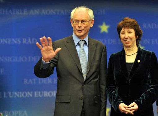 比利時首相赫爾曼·范龍佩(左)和歐盟貿(mào)易委員凱瑟琳·阿什頓在當(dāng)選后出席新聞發(fā)布會。