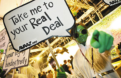 環(huán)保人士高舉“給我真正協(xié)議”標(biāo)語牌,批評(píng)各國(guó)遲遲仍未達(dá)成減排協(xié)議。