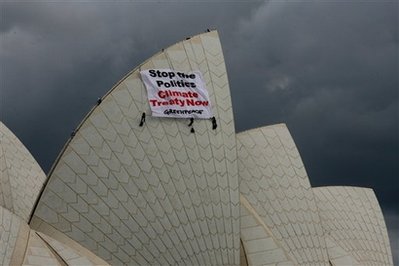 據(jù)報(bào)道,在哥本哈根召開的氣候峰會(huì)上,發(fā)達(dá)國家和發(fā)展中國家兩大陣營之間仍在僵持,各界對峰會(huì)結(jié)果的悲觀情緒彌漫會(huì)場。15日,5名綠色和平組織成員抓著繩索爬上了悉尼歌劇院,并拉開一個(gè)100平米大的條幅,上面寫著“不要再玩政治——立刻達(dá)成氣候協(xié)議”。事后,這5人被警方逮捕。