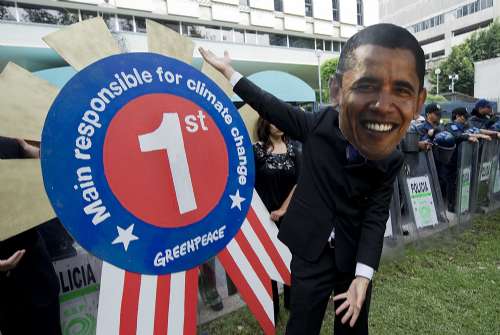 綠色和平組織成員戴著奧巴馬的面具,抗議美國政府的氣候政策。