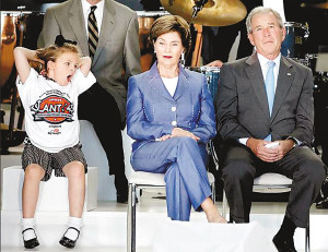 布什夫婦參加一社區(qū)服務(wù)項目,布什發(fā)呆的樣子,與旁邊伸懶腰打呵欠的小女孩相映成趣。