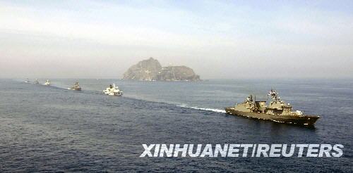 資料圖片:2008年7月30日,韓國海軍艦船參與在韓國東部海域的獨島(日本稱竹島)周邊地區(qū)舉行的大規(guī)模?哲娐(lián)合演習(xí)。