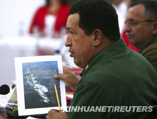 1月8日,在委內瑞拉首都加拉加斯,委內瑞拉總統(tǒng)查韋斯在總統(tǒng)府出席部長會議時展示一張飛機圖片。新華社/路透