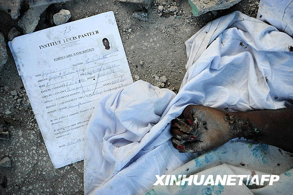 這張1月14日拍攝于海地首都太子港的一座護(hù)士學(xué)校廢墟中的照片是一名遇難護(hù)士的遺體。 加勒比島國海地當(dāng)?shù)貢r間12日下午發(fā)生里氏7.3級強(qiáng)烈地震,首都太子港大量房屋倒塌,交通通訊中斷,人員傷亡情況至今難以統(tǒng)計,海地領(lǐng)導(dǎo)人估計死亡人數(shù)可能達(dá)到數(shù)萬人。新華社/法新