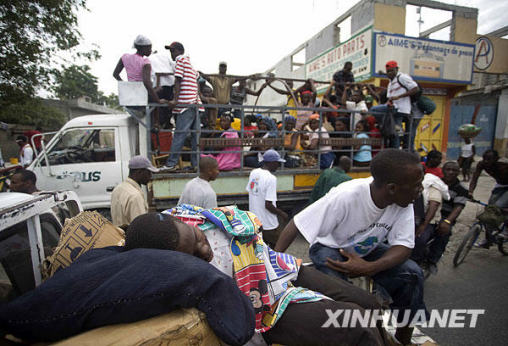 1月14日,當(dāng)?shù)鼐用裨噲D離開海地首都太子港。海地當(dāng)?shù)貢r(shí)間12日下午發(fā)生強(qiáng)烈地震和多起余震,造成首都太子港大量房屋受損或倒塌,當(dāng)?shù)厝耸糠Q地震可能造成數(shù)萬人死亡。新華社記者戴維攝